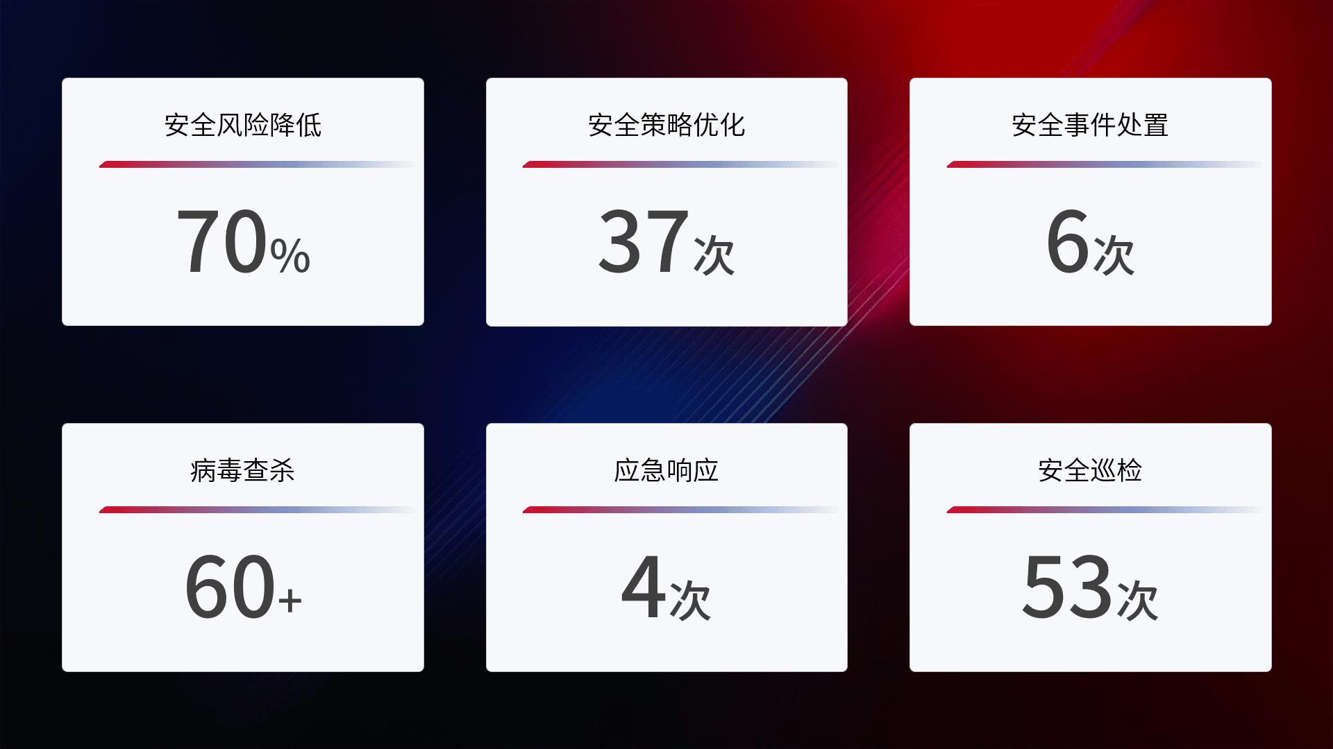 提供全面的安全事件报告体系,,,包括处置报告、、、周报、、、季度和年度总结,,,,结合持续监控,,帮助客户深入了解网络安全状况。。。